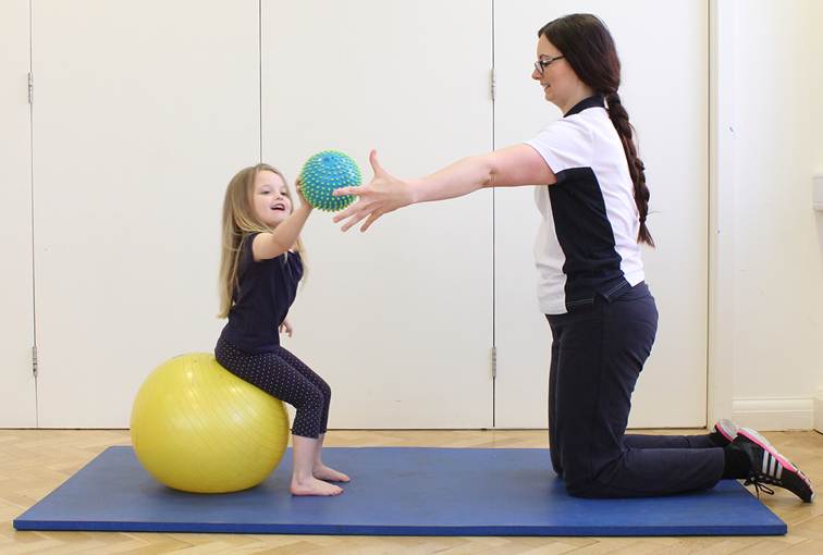 Çocuk bir denge topu veya yumuşak zeminde otururken dengede kalmaya ve basamak gibi nesnelerin üzerinden geçmeye çalışır.
